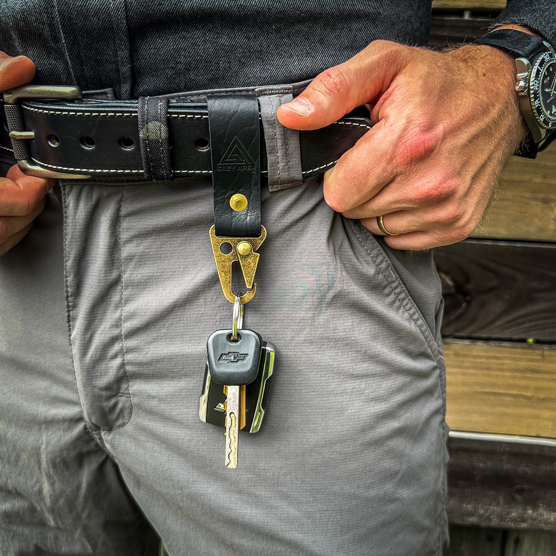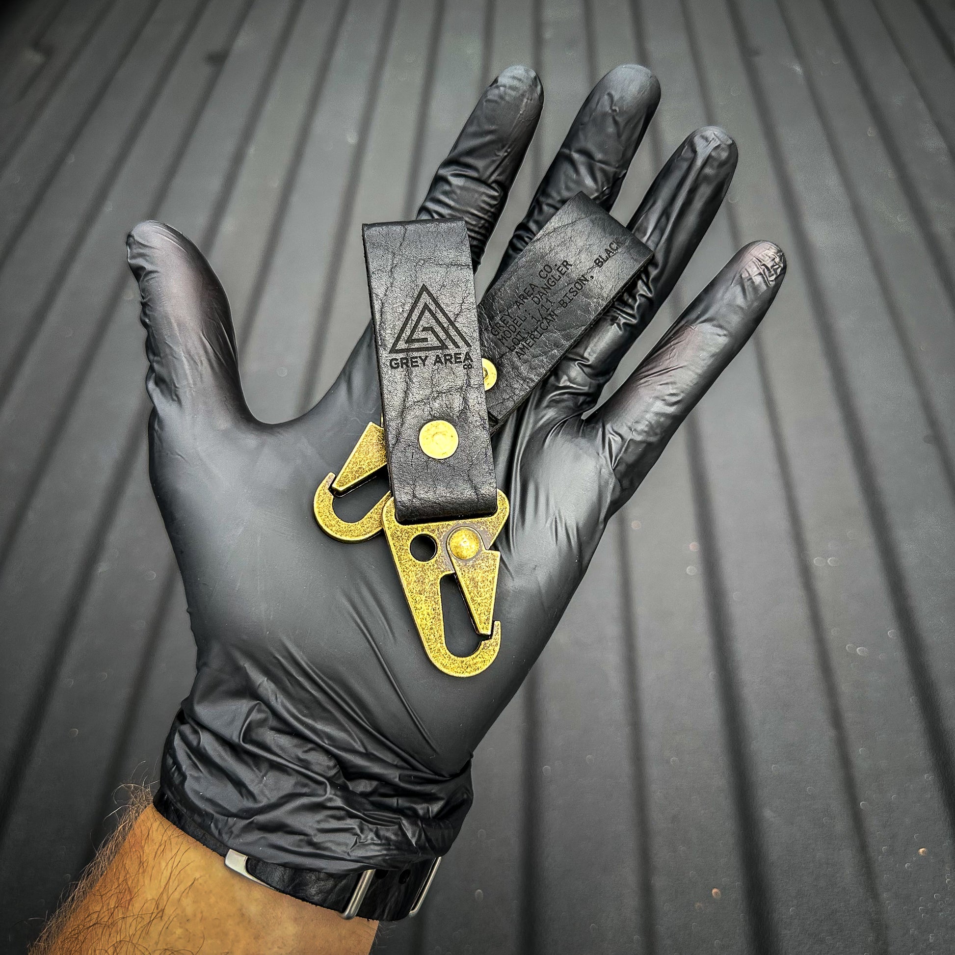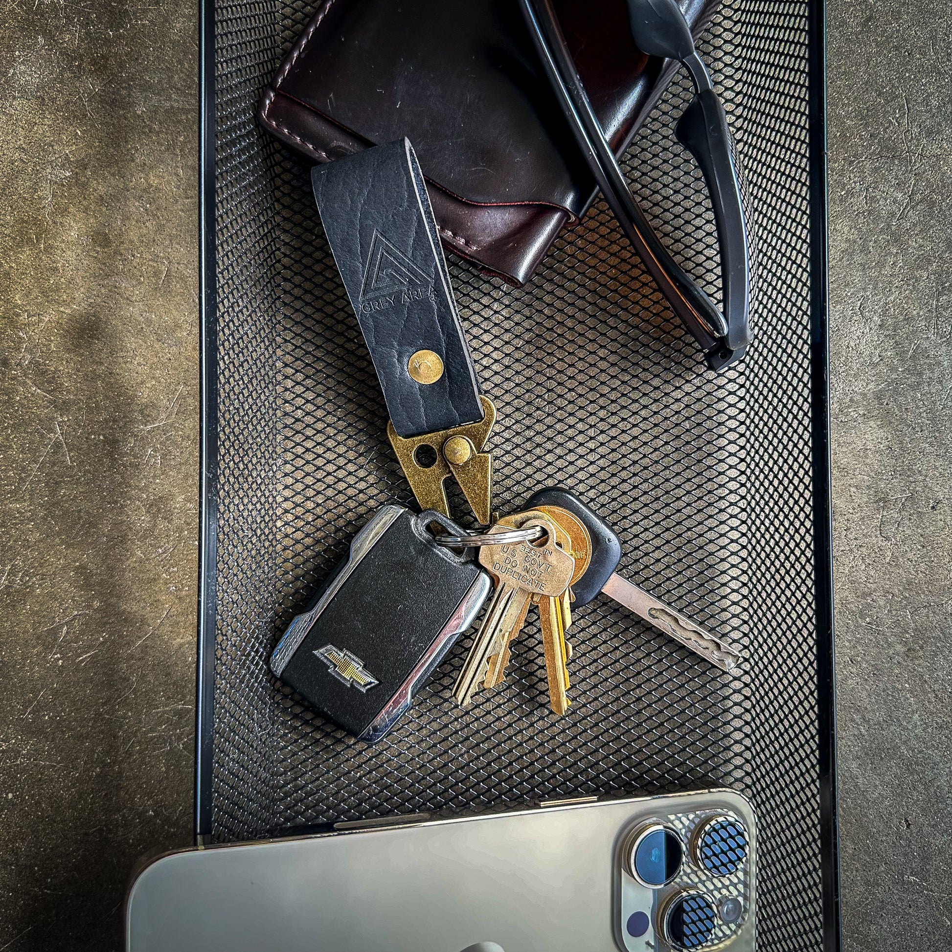 The HK clip/ snap clip is a familiar movement, and an excellent place to keep your keys, markers etc. Ours is constructed of black American Bison that conveniently dangles an antique brass finished aluminum snap clip. The dangler can fit on most belts up too 1.75"